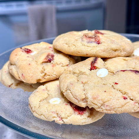 Sift in flour, baking powder, baking soda, and salt. Mix until just combined. Stir in the white chocolate and freeze-dried strawberries.